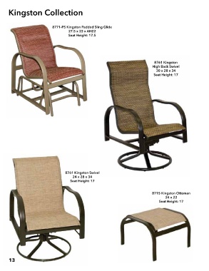 Kingston Collection 8771-PS Kingston Padded Sling Glide 27.5 x 23 x AH22 Seat Height: 17.5 8761 Kingston High Back Swivel 30 x 28 x 34 Seat Height: 17 8761 Kingston Swivel 24 x 28 x 34 Seat Height: 17 8715 Kingston Ottoman 24 x 22 Seat Height: 17 13