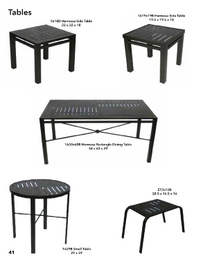 Tables 1619x19B Hermosa Side Table 19.5 x 19.5 x 18 1618D Hermosa Side Table 22 x 22 x 18 1630x60B Hermosa Rectangle Dining Table 34 x 63 x 29 Z13x16b 28.5 x 16.5 x 16 1629B Small Table 41 29 x 29