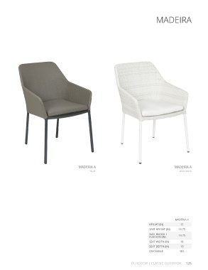 MADEIRA MADEIRA A MADEIRA A TAUPE WHITE WASH MADEIRA A HEIGHT (IN) 33 SEAT HEIGHT (IN) 18.75 SEAT HEIGHT / 19.75 CUSHION (IN) SEAT WIDTH (IN) 18 SEAT DEPTH (IN) 19 STACKABLE YES OUTDOOR | CLASSIC OUTDOOR 126