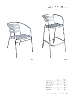 AL-02 / BAL-52 AL-02 BAL-52 POLISHED ALUMINUM POLISHED ALUMINUM AL-02 BAL-52 HEIGHT (IN) 28.5 39 SEAT HEIGHT (IN) 17.5 30 SEAT WIDTH (IN) 17.75 16 SEAT DEPTH (IN) 17 15.5 WEIGHT (LB) 8 10 STACKABLE YES NO OUTDOOR | CLASSIC OUTDOOR 134