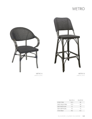 METRO METRO A METRO B CHARCOAL | BLACK CHARCOAL | BLACK METRO A METRO B HEIGHT (IN) 32.5 45 SEAT HEIGHT (IN) 17.5 30 SEAT WIDTH (IN) 16 16 SEAT DEPTH (IN) 16 12 STACKABLE YES NO OUTDOOR | CLASSIC OUTDOOR 148