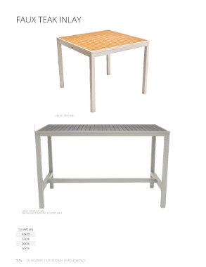 FAUX TEAK INLAY SILVER | FAUX TEAK GRAY | GRAY FAUX TEAK BAR HIGH BASE AVAILABLE IN 36”X70” ONLY SQUARE (IN) 32X32 32X48 36X36 36X70 175 OUTDOOR | OUTDOOR TOPS & BASES