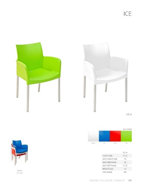 ICE ICE-A SEAT OPTIONS WHITE SKY ROJO LEAF ICE-A HEIGHT (IN) 33.75 SEAT HEIGHT (IN) 18 SEAT WIDTH (IN) 18 SEAT DEPTH (IN) 17.25 WEIGHT (LB) 10 ICE-A STACKABLE STACKABLE YES INDOOR / OUTDOOR | PEDRALI ® 190
