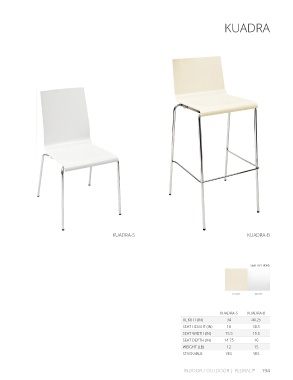 KUADRA KUADRA-S KUADRA-B SEAT OPTTIONS IVORY WHITE KUADRA-S KUADRA-B HEIGHT (IN) 34 40.25 SEAT HEIGHT (IN) 18 30.5 SEAT WIDTH (IN) 15.5 15.5 SEAT DEPTH (IN) 14.75 16 WEIGHT (LB) 12 15 STACKABLE YES YES INDOOR / OUTDOOR | PEDRALI ® 194