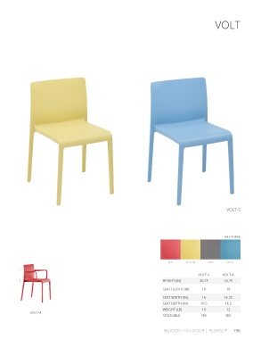 VOLT VOLT-S SEAT OPTIONS RED YELLOW GRAY BLUE VOLT-S VOLT-A HEIGHT (IN) 30.75 30.75 SEAT HEIGHT (IN) 18 18 SEAT WIDTH (IN) 16 16.25 SEAT DEPTH (IN) 16.5 16.5 WEIGHT (LB) 10 12 VOLT-A STACKABLE YES YES INDOOR / OUTDOOR | PEDRALI ® 196