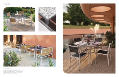 TRAVIRA DETAILS PAGES 64-68 ALUMINUM POWDER COATED FRAMES AND TABLE LEGS ELECTROPLATED STEEL TABLE POST AND BASE SEATING AVAILABLE WITh SLING, WICkER, OR SLATS TABLES AVAILABLE WITh SLAT OR LITE-CORE TOPS SEE DETAILS FOR AVAILABLE FINIShES 20 21