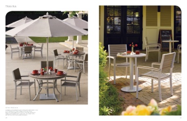 TRAVIRA DETAILS PAGES 64-68 ALUMINUM POWDER COATED FRAMES AND TABLE LEGS ELECTROPLATED STEEL TABLE POST AND BASE SEATING AVAILABLE WITh SLING, WICkER, OR SLATS TABLES AVAILABLE WITh SLAT OR LITE-CORE TOPS SEE DETAILS FOR AVAILABLE FINIShES 28 29