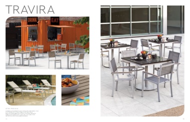 TRAVIRA DETAILS PAGES 64-68 ALUMINUM POWDER COATED FRAMES AND TABLE LEGS ELECTROPLATED STEEL TABLE POST AND BASE SEATING AVAILABLE WITh SLING, WICkER, OR SLATS TABLES AVAILABLE WITh SLAT OR LITE-CORE TOPS SEE DETAILS FOR AVAILABLE FINIShES 14 15