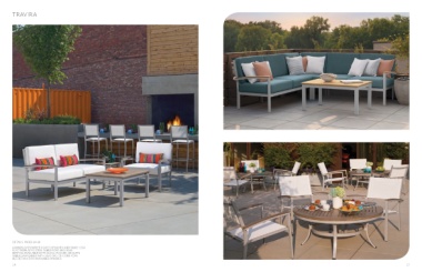 TRAVIRA DETAILS PAGES 64-68 ALUMINUM POWDER COATED FRAMES AND TABLE LEGS ELECTROPLATED STEEL TABLE POST AND BASE SEATING AVAILABLE WITh SLING, WICkER, OR SLATS TABLES AVAILABLE WITh SLAT OR LITE-CORE TOPS SEE DETAILS FOR AVAILABLE FINIShES 16 17