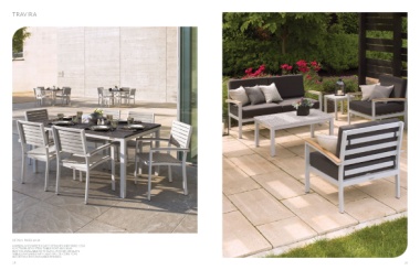 TRAVIRA DETAILS PAGES 64-68 ALUMINUM POWDER COATED FRAMES AND TABLE LEGS ELECTROPLATED STEEL TABLE POST AND BASE SEATING AVAILABLE WITh SLING, WICkER, OR SLATS TABLES AVAILABLE WITh SLAT OR LITE-CORE TOPS SEE DETAILS FOR AVAILABLE FINIShES 18 19